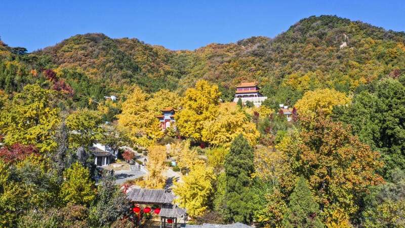 这是10月23日在河北省遵化市侯家寨乡禅林寺古银杏树风景区拍摄的秋景(无人机照片)。新华社发(刘满仓 摄)