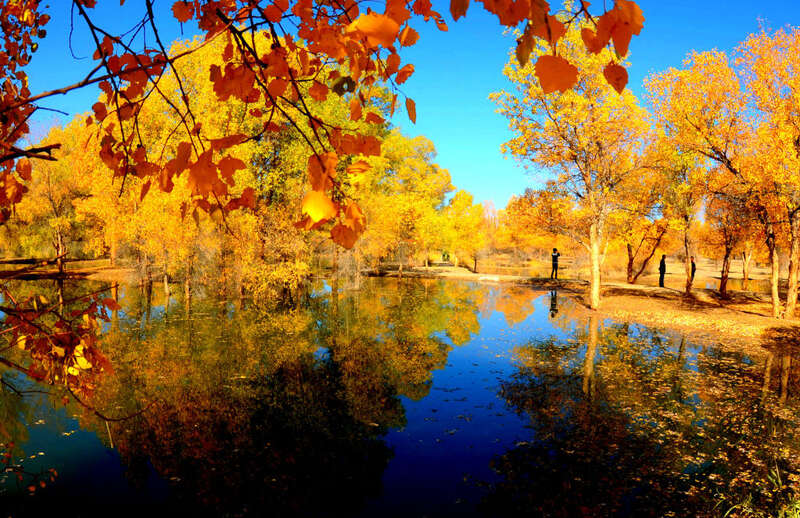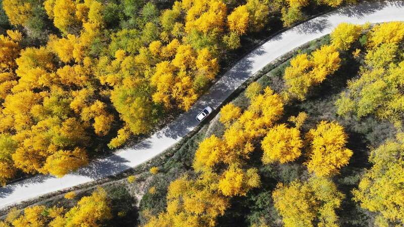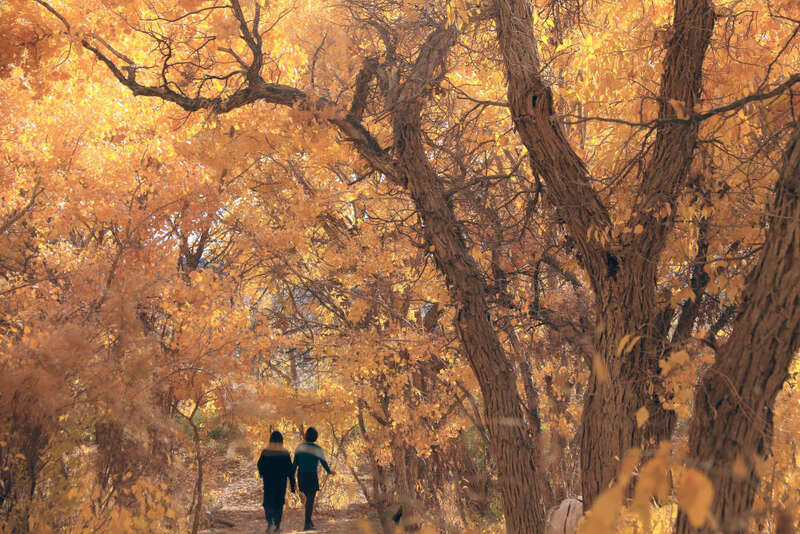 10月25日,游客在甘肃省敦煌市莫高镇的胡杨林中游玩。新华社发(张晓亮 摄)