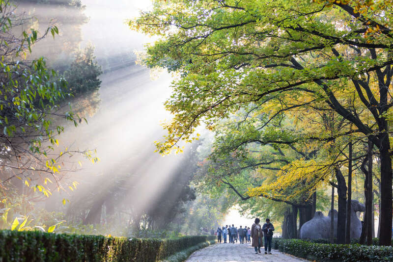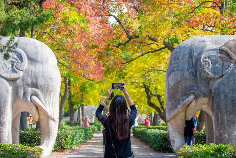 10月23日,游人在江苏省南京明孝陵景区石象路赏景拍照。新华社发(苏阳 摄)
