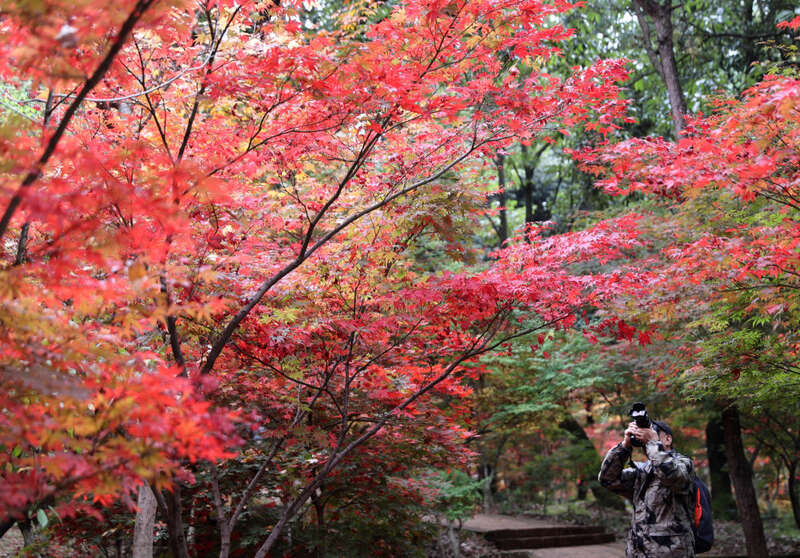 10月28日,市民在云南昆明黑龙潭公园枫叶区赏景拍照。新华社发(梁志强 摄)