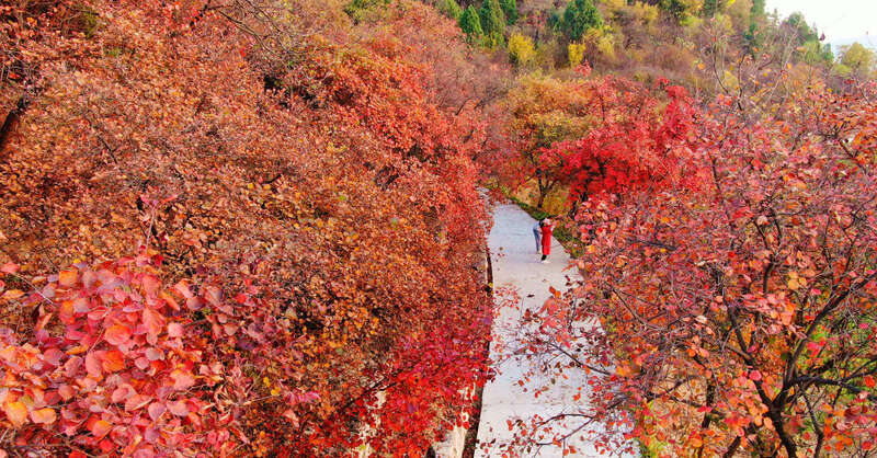 10月21日,游客在山东省青岛市西海岸新区张家楼街道张家楼村枫树林赏景游玩。新华社发(王培珂 摄)