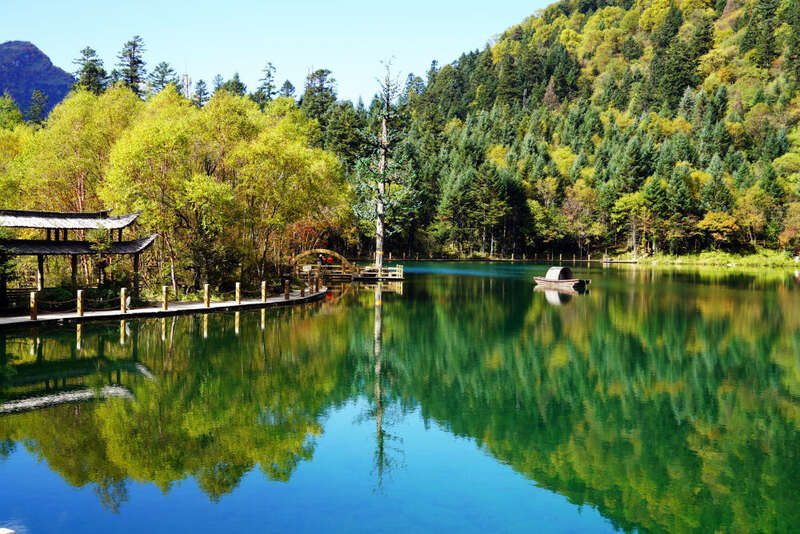 这是9月28日在甘肃省宕昌县官鹅沟泽荡措拍摄的秋景。新华社发(刘辉 摄)