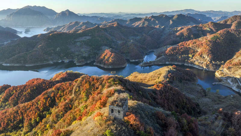 10月24日在河北省承德市与唐山市交界处的潘家口水库拍摄的长城秋景(无人机照片)。新华社发(刘满仓 摄)