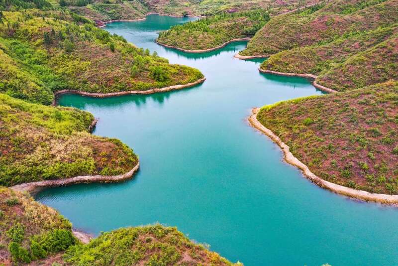 这是10月10日在贵州省铜仁市玉屏侗族自治县白岩河水库拍摄的秋景(无人机照片)。新华社发(胡攀学 摄)