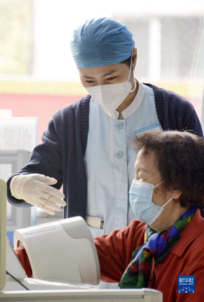 北京市丰台区方庄社区卫生服务中心的医护人员在协助一名老人测量血压(10月26日摄)。