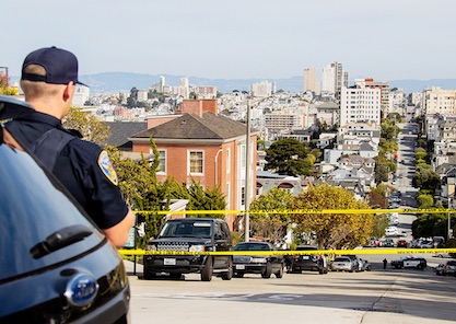 2022年10月28日,美国旧金山,佩洛西丈夫在家中被入侵者袭击后,警方和联邦调查局特工在佩洛西家附近工作,道路已拉上警戒线。澎湃影像 图