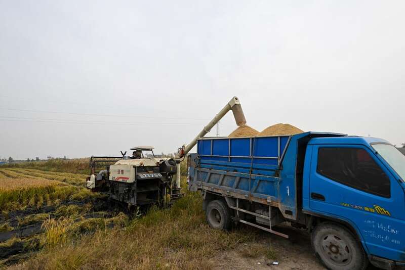 10月13日,在天津市津南区小站镇坨子地村,新收稻谷正在装车。新华社记者 孙凡越 摄
