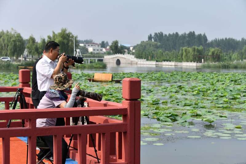 摄影爱好者在微山湖拍摄野生鸟类(2022年7月21日摄)。新华社记者 徐速绘 摄