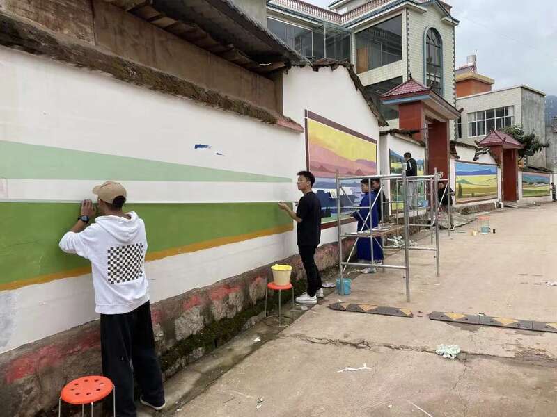 昆明城市学院艺术学院师生在东村的民居上创作壁画。昆明城市学院供图