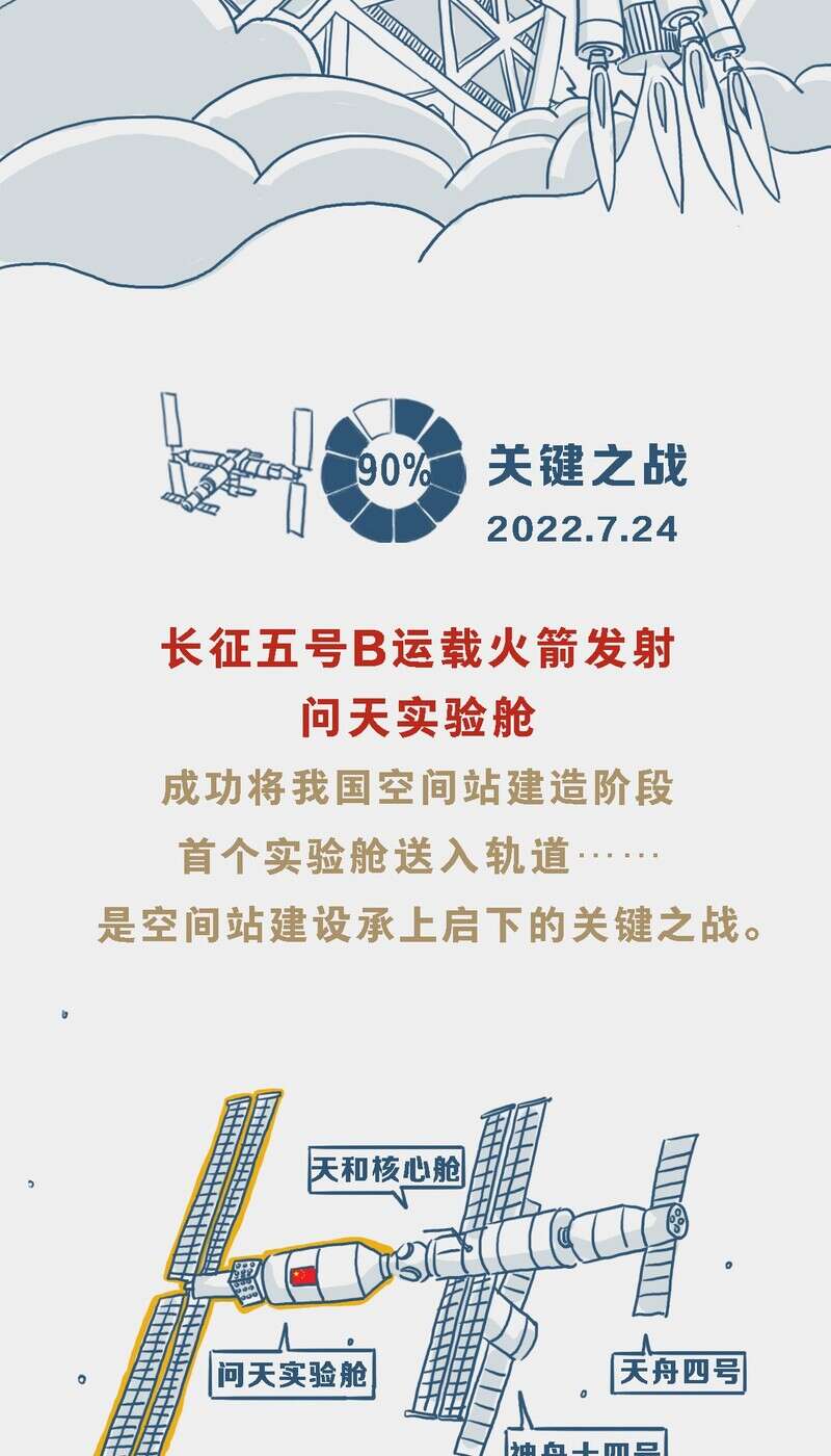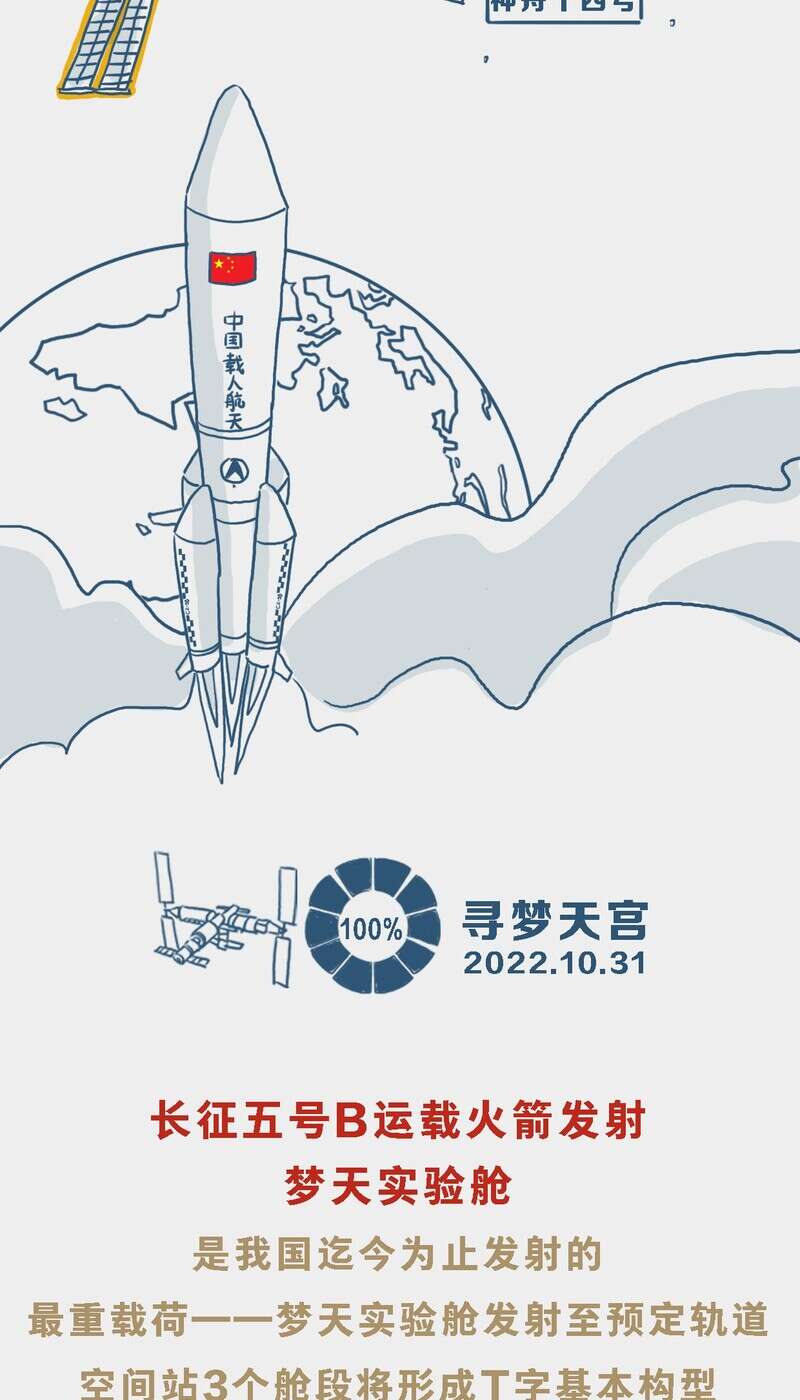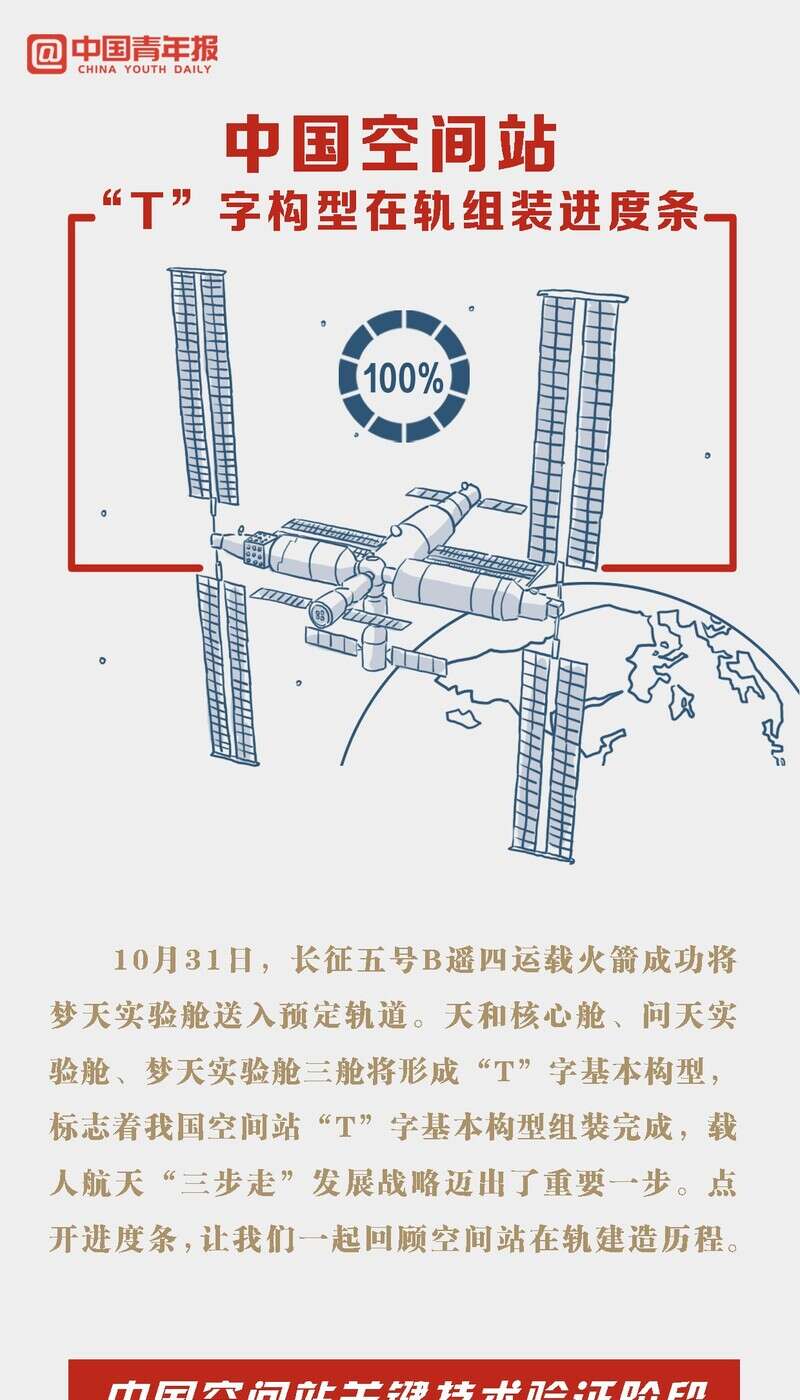中国青年报客户端北京航天城10月31日电(董佳莹 钱航 中青报·中青网记者 邱晨辉)北京时间10月31日,长征五号B遥四运载火箭成功将梦天实验舱送入预定轨道。天和核心舱、问天实验舱、梦天实验舱三舱将形成“T”字基本构型, 标志着我国空间站“T”字基本构型组装完成,载人航天“三步走”发展战略迈出了重要一步。点开进度条,让我们一起回顾空间站在轨建造历程。
