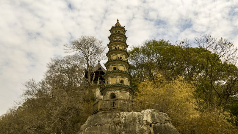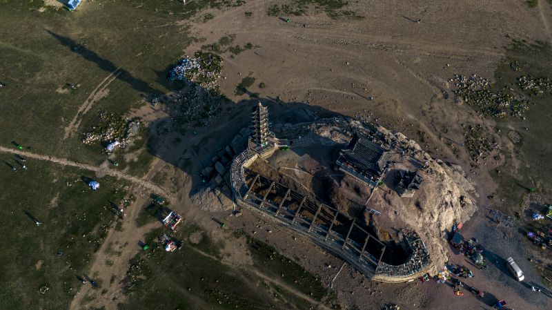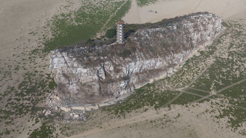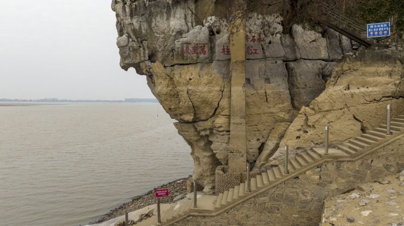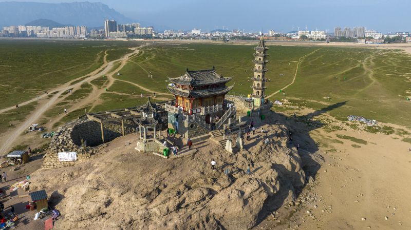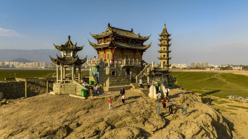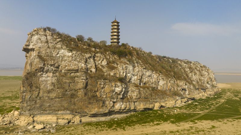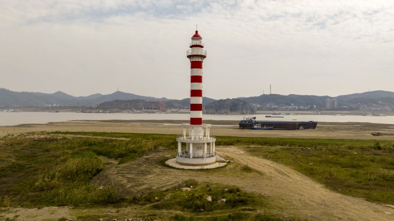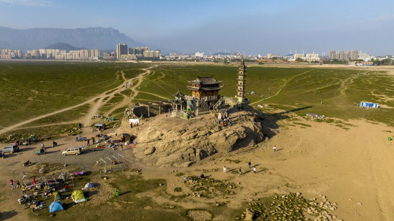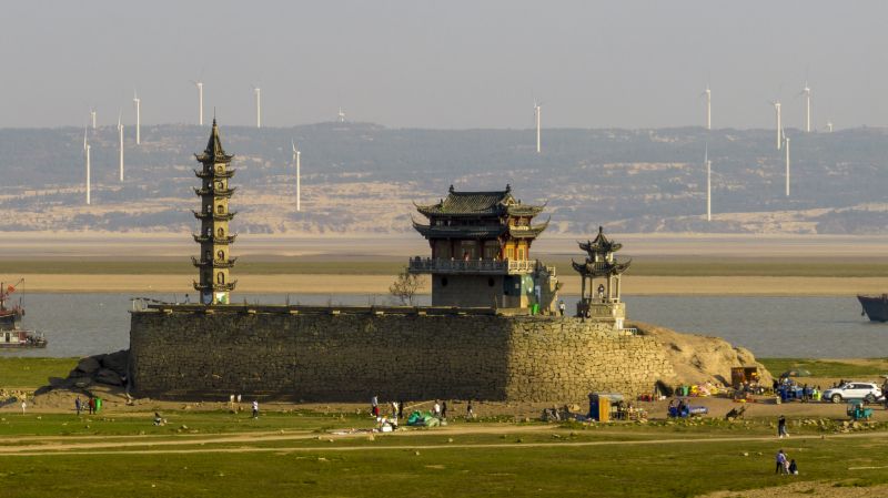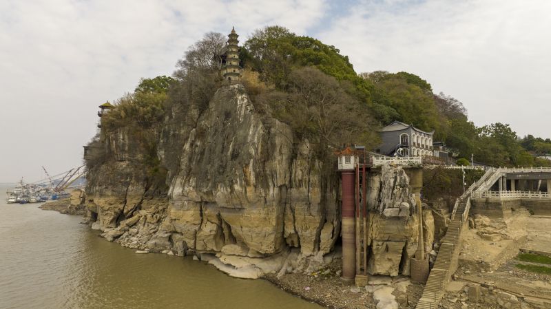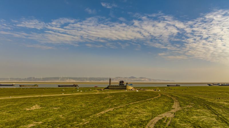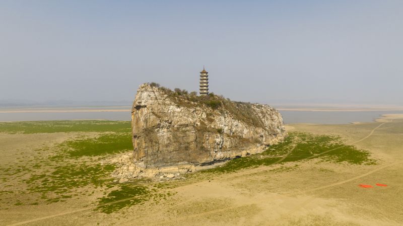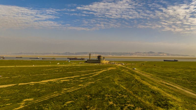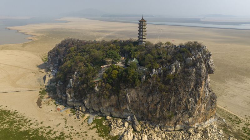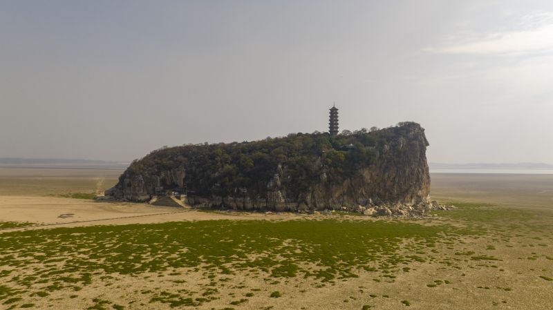 2022年10月30日,江西九江,湖口县的鞋山露出水面,湖床已长满杂草。
