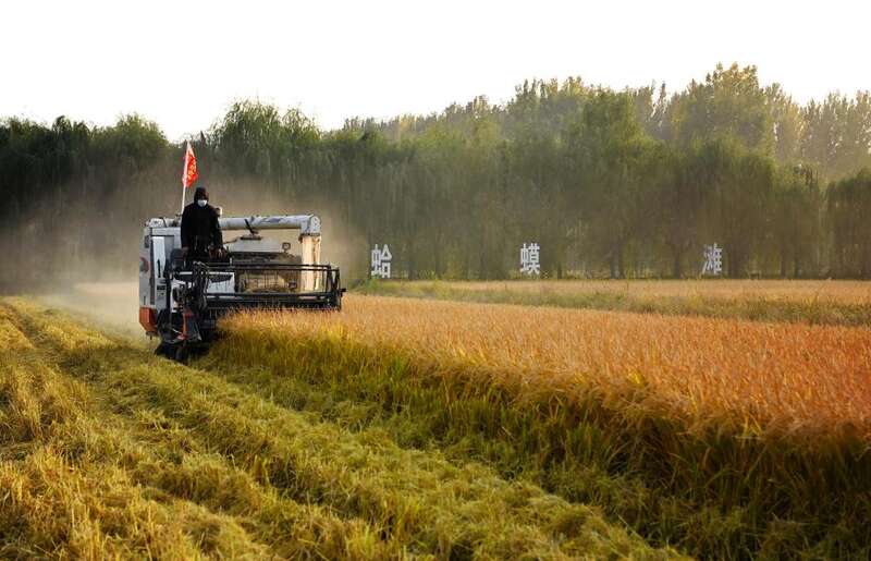 在西安市长安区皇甫村十里蛤蟆滩稻花乡里农业景区,几百亩水稻田近日迎来收割期,金色稻浪在收割机碾过后扬起阵阵尘烟,从市区赶来看丰收的人们纷纷在稻田间合影留念。