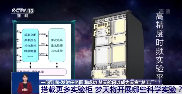 此外,在梦天实验舱,还配备有占据了两个实验柜的高精度时频实验系统,它通过不同特性原子钟组合,在空间站构建超高精度时间频率产生和运行系统,可以支持相对论、引力物理等基础前沿研究及全球重力位测量等应用研究。
