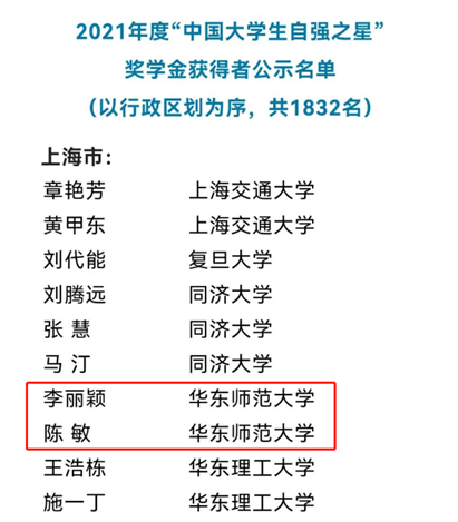 由共青团中央、全国学联指导,中国青年报社、新东方教育科技集团、中国青年创业就业基金会联合举办的2021年度“中国大学生自强之星”奖学金推报活动结果揭晓,经各高校推荐、省级初评、全国评审等环节,华东师大计算机科学与技术学院2019级博士研究生李丽颖和物理与电子科学学院、孟宪承书院的2020级本科公费师范生陈敏荣获2021年度“中国大学生自强之星”奖学金!