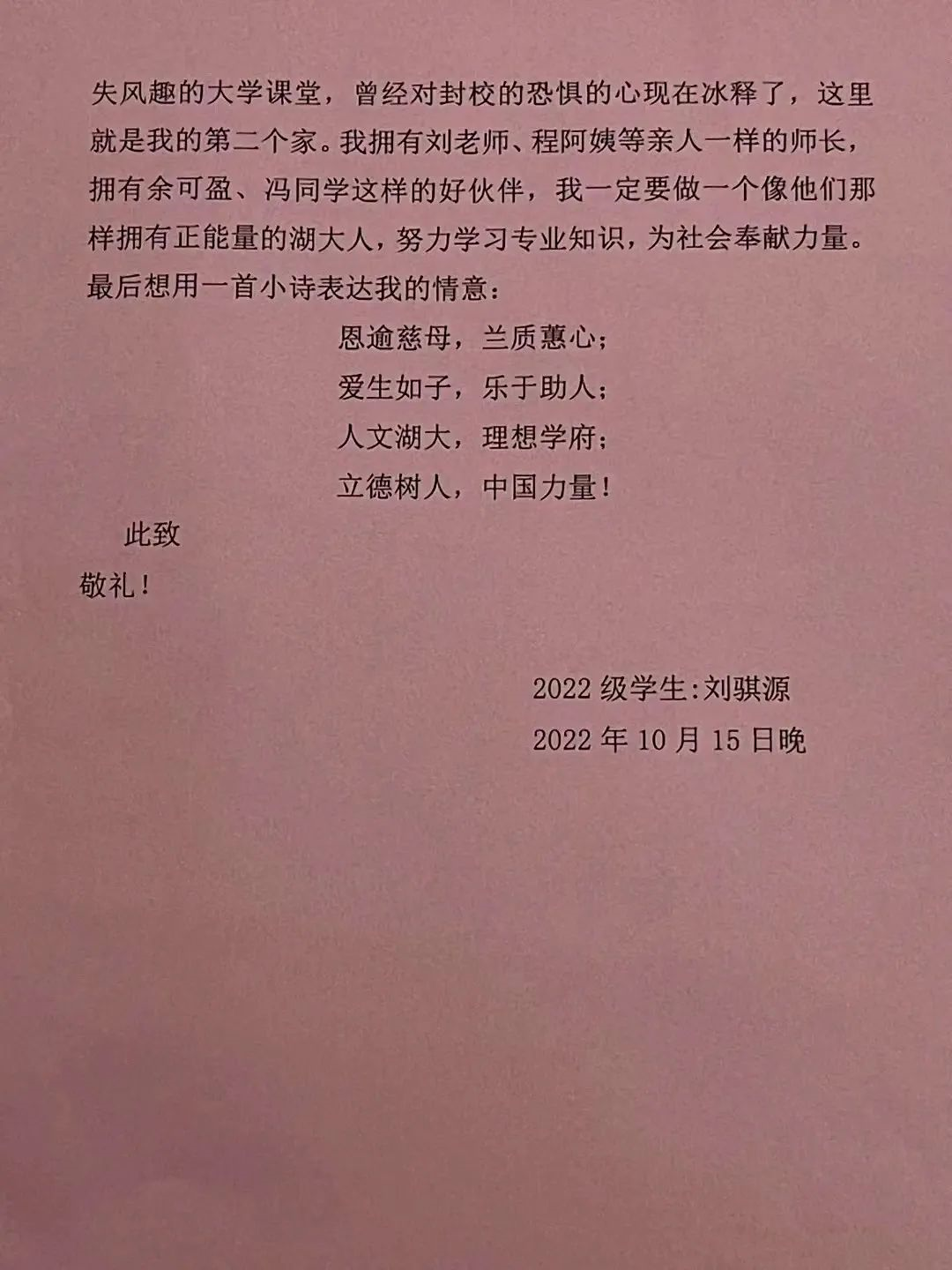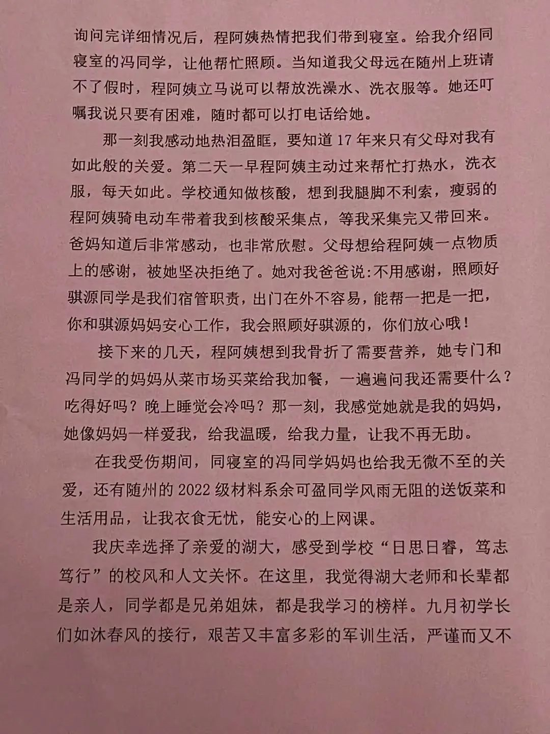 刘骐源说:“我很庆幸自己选择了湖大,遇到了很多像程阿姨这样温暖的人,也感受到了湖大‘日思日睿,笃志笃行’的校风和人文关怀,他们都是我学习的榜样。”