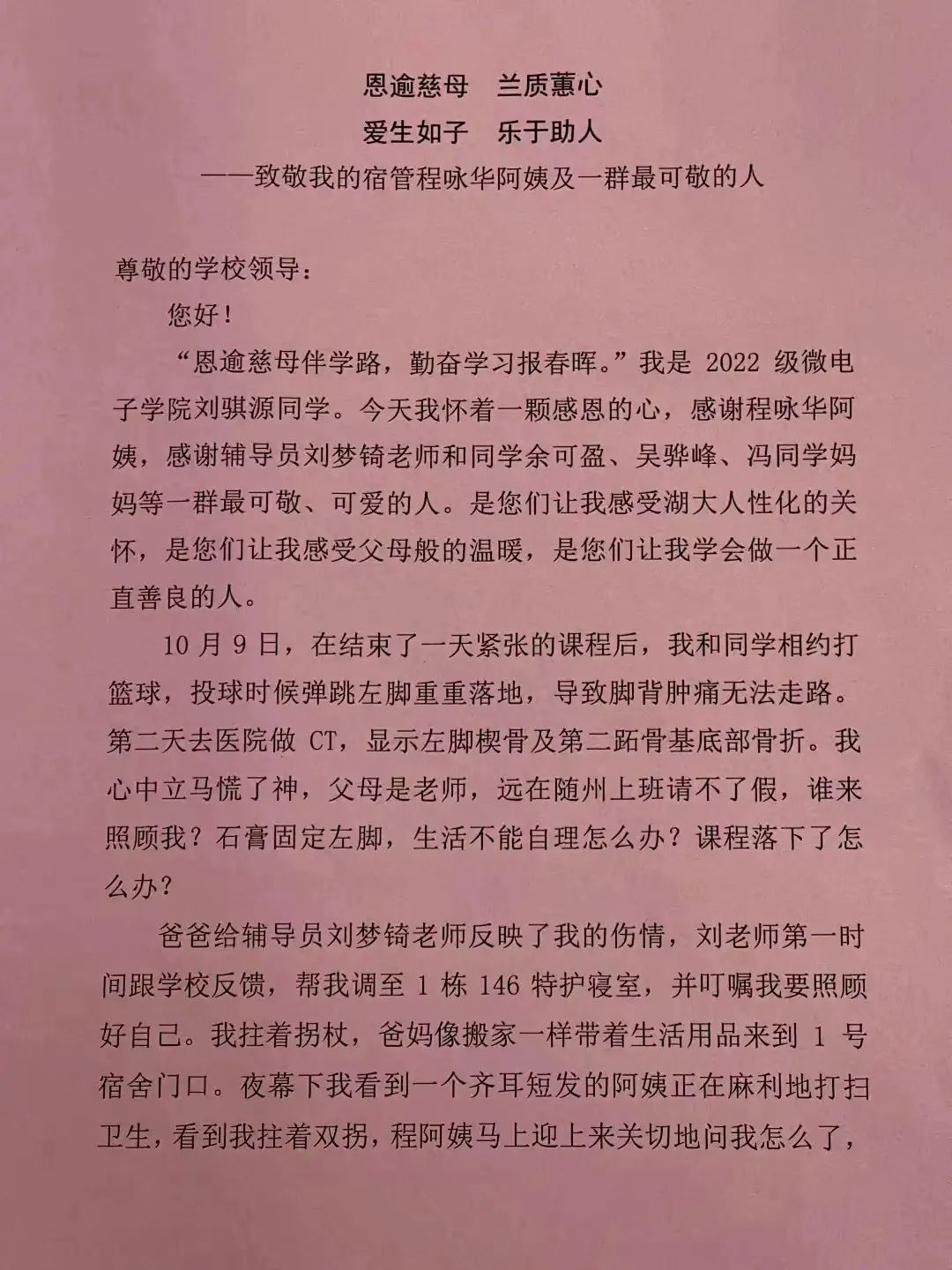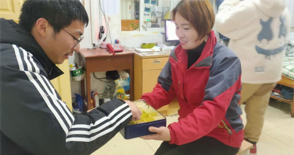 打完石膏的刘骐源拄着拐杖进入宿舍楼,正在打扫卫生的程咏华看到这一幕,马上带他到特护寝室住下。第二天一早,程咏华主动来帮刘骐源洗衣服、打热水,每天如此。考虑到刘骐源骨折需要补充营养,程咏华专门买菜为他加餐。