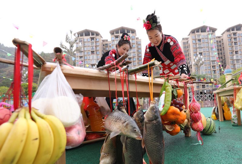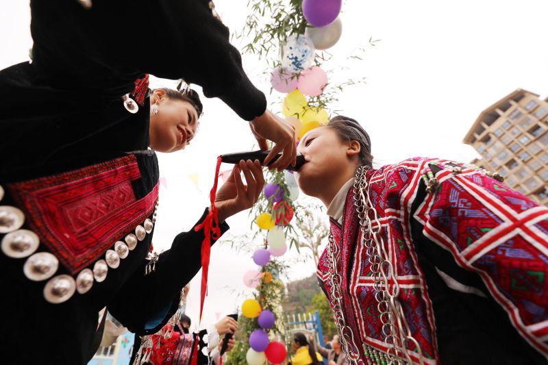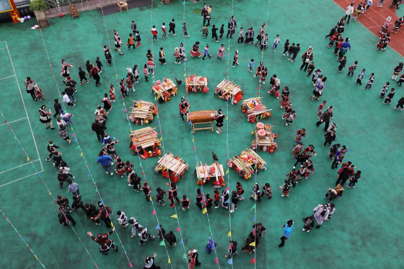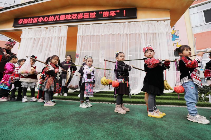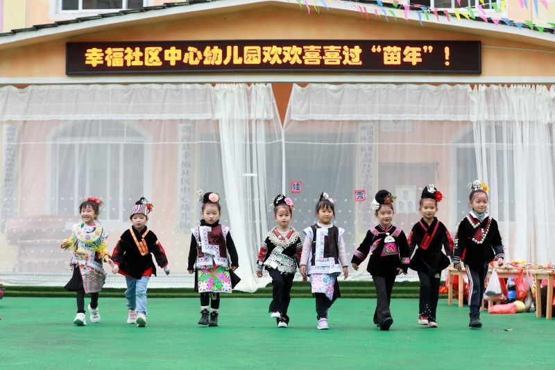 2022年10月28日,贵州黔东南,剑河县幸福社区中心幼儿园,师生们穿着节日盛装,通过踩水鼓舞、打糍粑、品长桌宴等丰富多彩的苗年传统习俗,欢度苗年。