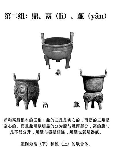 【辨别方法】 鼎和鬲最根本的区别是鼎的三足为实心,而鬲的三足空心。而且鼎可以明显分为腹与足两部分,鬲的腹与足不易分开,足壁与器壁相连,足壁也就是器底。 甗下部为鬲,煮水;上部为甑(zèng),甑底部有孔,叫“箅(bì)”,用于蒸煮食物。