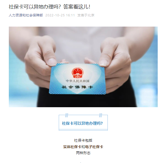 全国统一的社保卡“跨省通办”服务正式上线,群众可通过国家政务服务平台、掌上12333APP移动端等渠道,在线办理社保卡申领、社保功能启用、补换、临时挂失、制卡进度查询等“跨省通办”服务,线上提交申请,卡片邮寄到家。