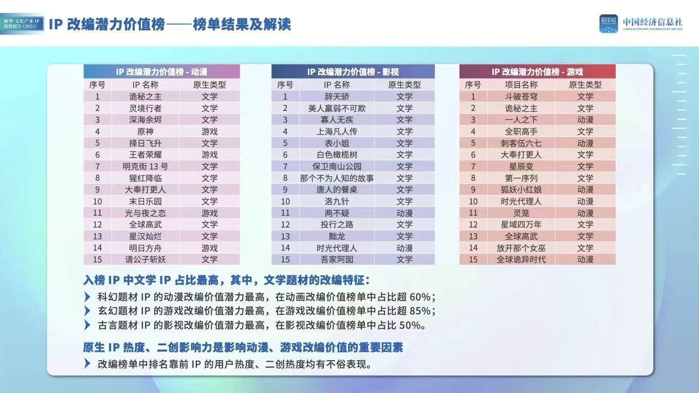 本次《报告》增设IP改编潜力价值评价体系,对适合进行动漫、影视、游戏三大方向改编的IP的潜力价值进行量化评价,并公布三个榜单,共计45个潜力IP。