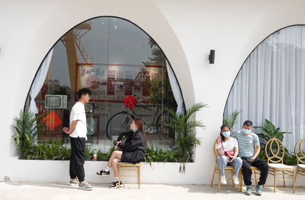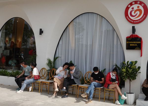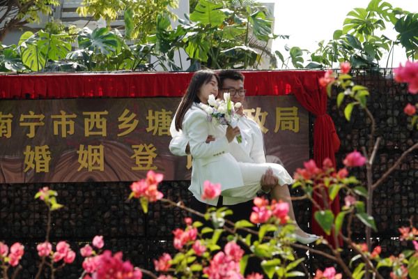 2022年11月1日,南宁,西乡塘区上尧码头江北公园婚姻登记处,一对新人在拍照留念。