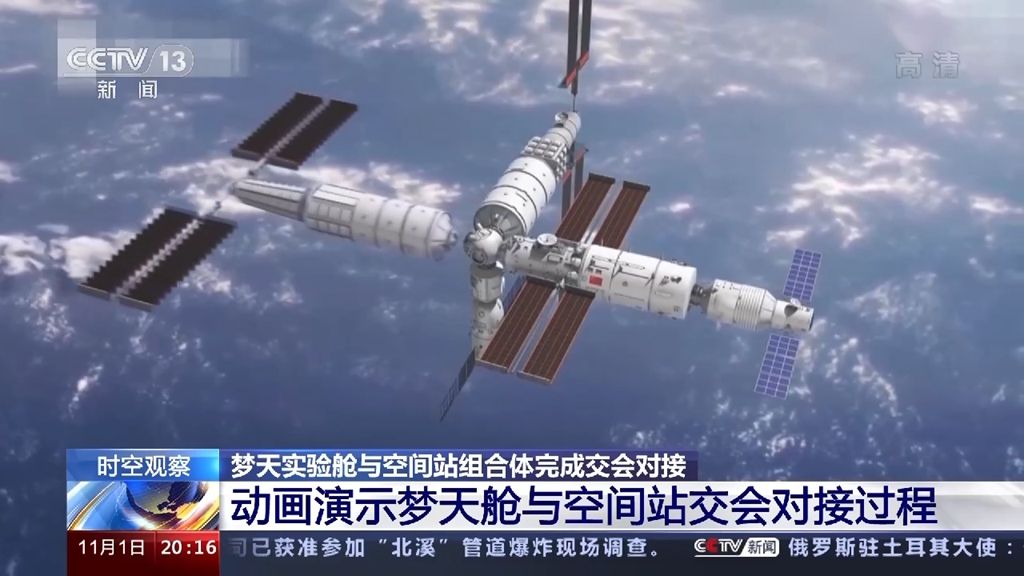 此后,梦天实验舱采取“追”空间站组合体的方式进行交会对接,它们之间的距离也不断缩短,当梦天舱距离空间站5公里时,进入全自主交会对接。最后通过对接机构,梦天实验舱和空间站组合体牢牢抓在一起并锁紧,完成对接。