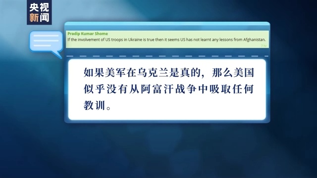 对于美国的军事活动,有网友讽刺说,“如果美军在乌克兰是真的,那么美国似乎没有从阿富汗战争中吸取任何教训。”