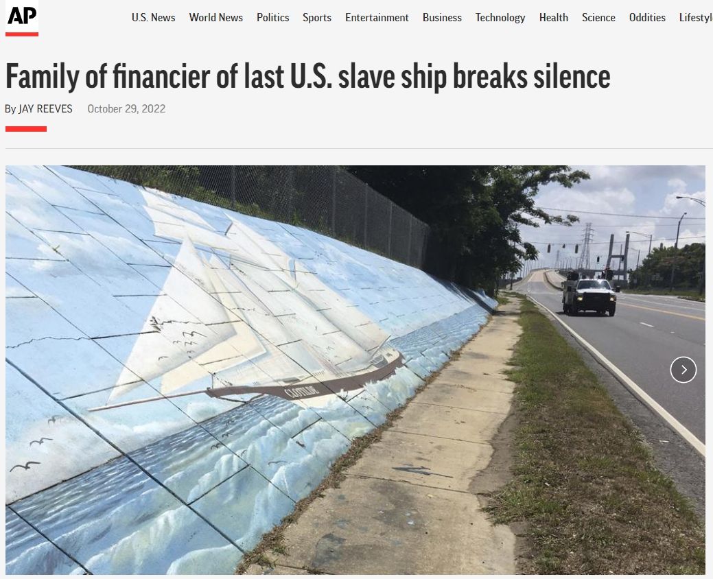 文章写道,关于帕特森的亲戚如何乘坐一艘非法奴隶船抵达美国的故事,一开始是一个令人震惊的轻率赌注。在美国禁止国际奴隶贸易52年后的1860年,亚拉巴马州富商蒂莫西·米赫打赌,他可以策划一批被绑架的非洲人,在联邦官员的眼皮底下航行,并逃脱追捕。在船长威廉·福斯特(William Foster)的协助下,他驾驶着一艘80英尺长的双桅纵帆船,经过六周艰苦的跨大西洋航行,他成功了。为了掩盖犯罪证据,这艘外观独特的纵帆船被点燃,然后沉到莫比尔河的沼泽深处,被隐藏在水下,它的存在已成为传说。