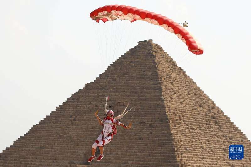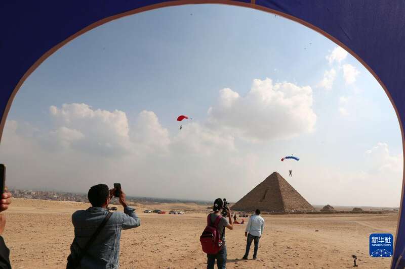 11月2日,在埃及吉萨金字塔景区,运动员进行跳伞表演。