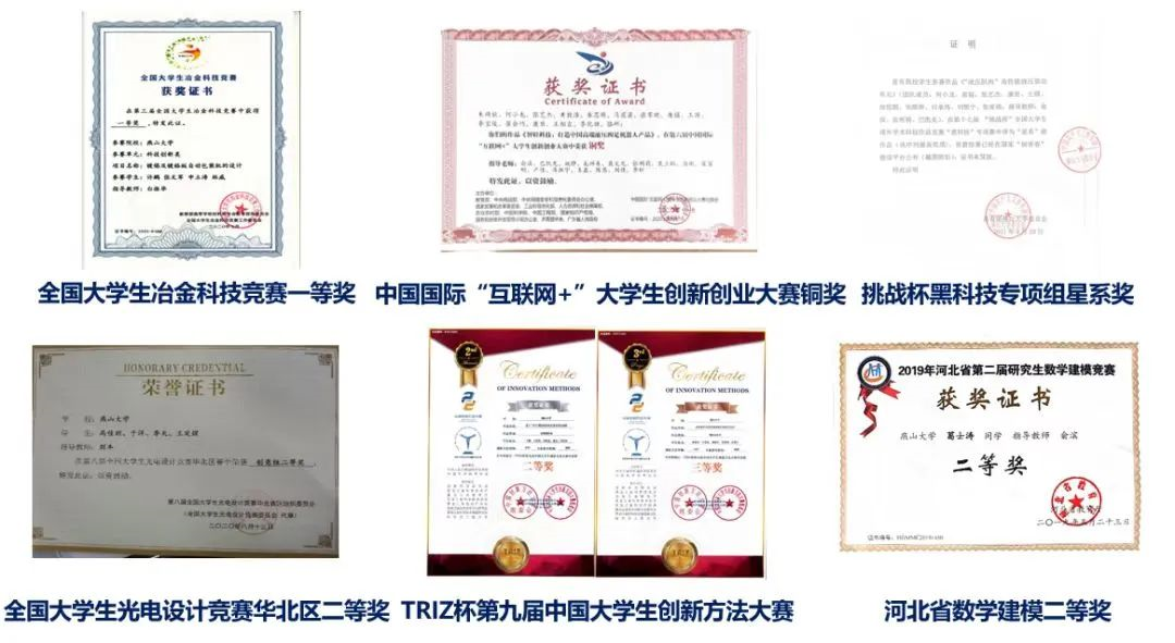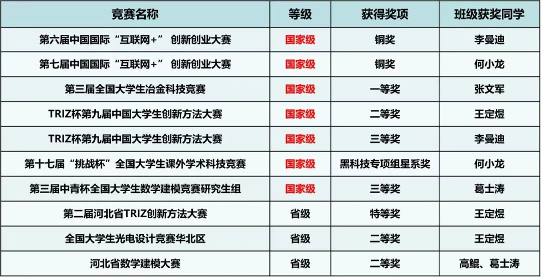 全班22名同学共参与中国国际“互联网+”创新创业大赛、TRIZ杯第九届中国大学生创新方法大赛、全国大学生冶金科技竞赛、河北省数学建模大赛、第八届全国大学生光电设计竞赛、挑战杯等20余项重要科技竞赛,斩获中国国际“互联网+”创新创业大赛铜奖两项、RIZ杯第九届中国大学生创新方法大赛二等奖和三等奖、全国大学生冶金科技竞赛一等奖、河北省数学建模大赛二等奖、第八届全国大学生光电设计竞赛创意组二等奖等、“挑战杯”全国大学生课外学术科技竞赛黑科技专项组星系奖等10余项。