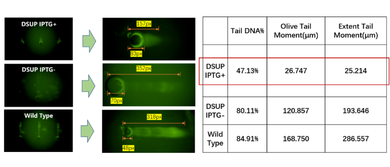 本项目中,Odyssey采用“阴阳码”作为基本编码方式,其信息存储密度可达每个碱基1.96 字节。在此基础上,团队将登月歌曲《Fly Me to The Moon》的一段歌词翻译成碱基序列并存储进枯草芽孢杆菌基因组。枯草芽孢杆菌被诱导产生芽孢,芽孢对于恶劣环境有着强烈的抵抗能力,NASA的实验表明芽孢能够在近地轨道存活超过90天。但是,考虑漫漫征途中可能遇到的种种危险与挑战,尤其是银河宇宙射线(GCR)对DNA的损害,Odyssey通过基因工程手段进一步对芽孢进行改造,分别从芽孢内部和芽孢外部进行抵抗辐射的修饰。在芽孢内部,引入水熊虫DSUP蛋白,该蛋白能够结合DNA从而起到对辐射的屏障作用。在芽孢外部通过表面展示系统,构建了黑色素生成与锚定的酶与结合肽体系,实现在芽孢外部形成抵抗紫外线的黑色素保护。最终在紫外损伤实验中,我们成功实现了DSUP蛋白和黑色素对枯草芽孢杆菌的保护,基因组测序表明我们的体系能够有效避免枯草芽孢杆菌DNA的突变,起到了DNA信息存储的保护作用。