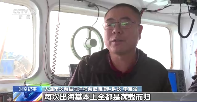 大连市长海县海洋岛海域捕捞队队长 李宝强:我们现在是轮播、轮养、轮捕、轮休的循环式生产模式。现在政策(也)好,不让偷捕滥捕,(这样我们)可以确保一年四季,有足量的虾贻扇贝。