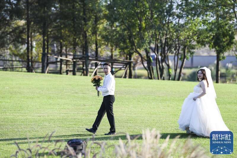 ↑11月2日,新人在重庆广阳岛拍摄婚纱照。