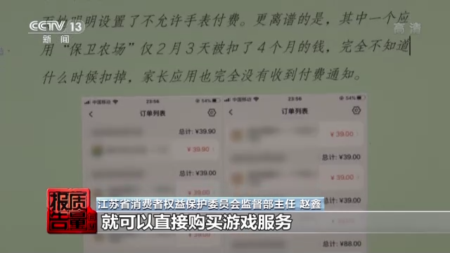 江苏省消费者权益保护委员会监督部主任 赵鑫:通过舆情搜索,我们还发现许多家长投诉反映,在电话手表绑定的家长端,并未开启免密支付和支付确认的前提下,孩子在电话手表端就可以直接购买游戏服务,能从家长端直接扣款,还存在着部分游戏软件重复扣款、多次扣款等问题,孩子在使用时极易被广告推送或者是游戏内容吸引,甚至进行大额的充值消费。