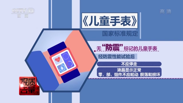 《儿童手表》国家标准规定,有“防震”标记的儿童手表,其防震性能应符合国家标准《钟表—防震手表》(GB/T 38022—2019)中对石英手表的要求。无“防震”标记的儿童手表,经防震性能试验后,不应停走,液晶显示正常,零、部、组件不应松动、脱落和损坏。