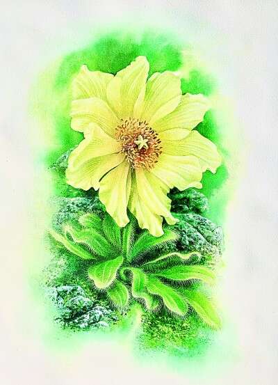 绿绒蒿生长在高海拔的环境中,为了画好它,我爬到云南白马雪山海拔4700米的地方。强烈的紫外线照射,空气又稀薄,寒风肆虐,在那么恶劣的条件下,它的花瓣在阳光下散发出缎子一般的光,风吹的时候还在颤颤发抖,像一个精灵在向我们召唤,太神奇了。不论植物还是动物都是有强烈的生存意识的,它们为了生存繁衍想出各种各样的“招数”,非常了不起。