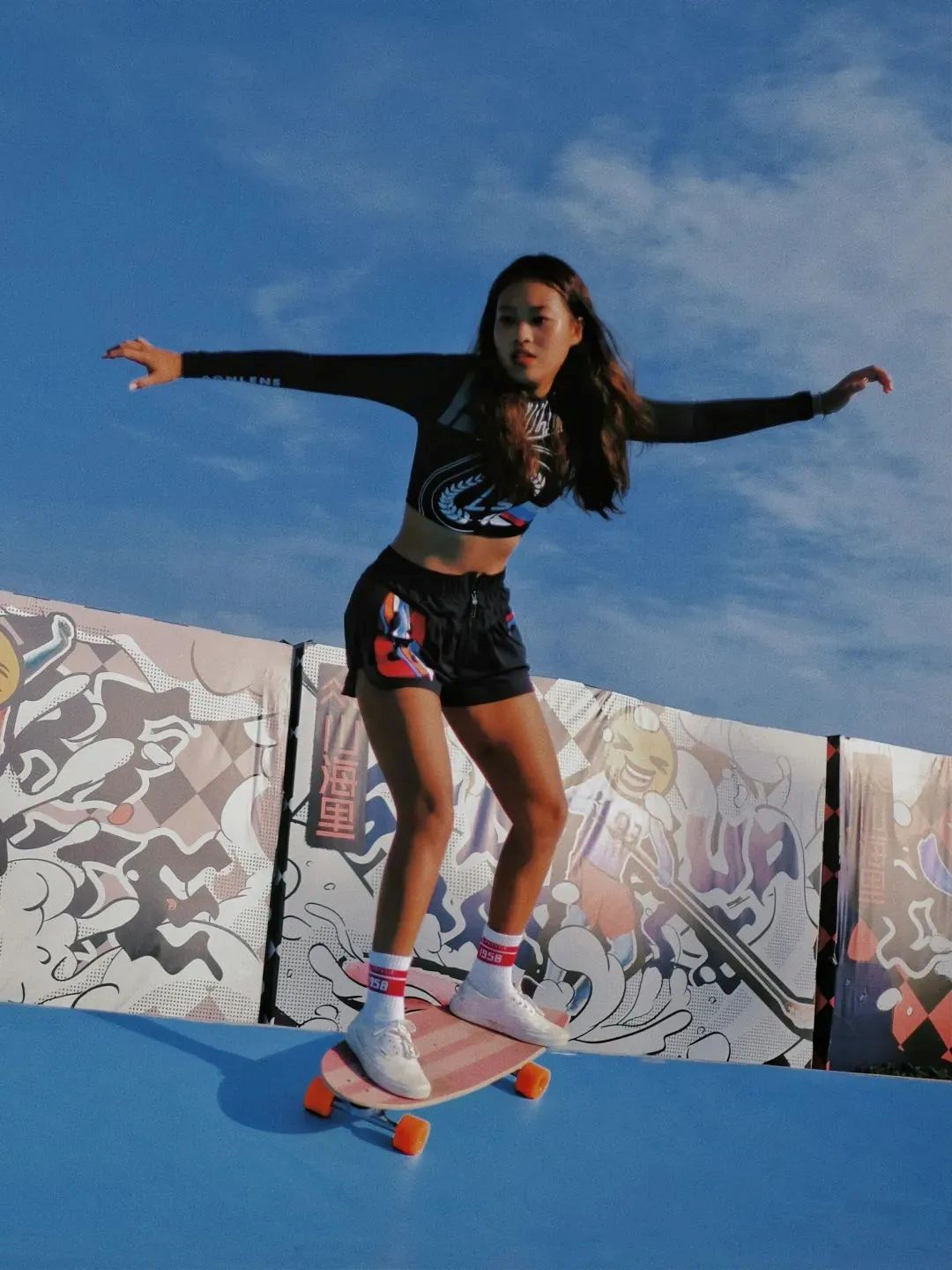 初中时流行玩死飞、玩双翘滑板,这个大胆自信的cool girl就冲在冒险的前线。为什么喜欢街头运动呢?佳佳觉得,相比于局限在固定空间、目的性较强的健身房撸铁,她更喜欢有体验感的东西,而极限运动很大的魅力,正是那些溢出“锻炼身体”本身的东西: