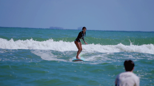 佳佳的冲浪初体验是在一家冲浪俱乐部,她和另一个男生拼团,有教练推板,有摄影师拍照,她成功在海浪上站了起来。后来摄影师成了男朋友,她也在盛夏搬到了海边,有空就去海里泡/跑,成为了一名听着涛声入睡的“浪人”。