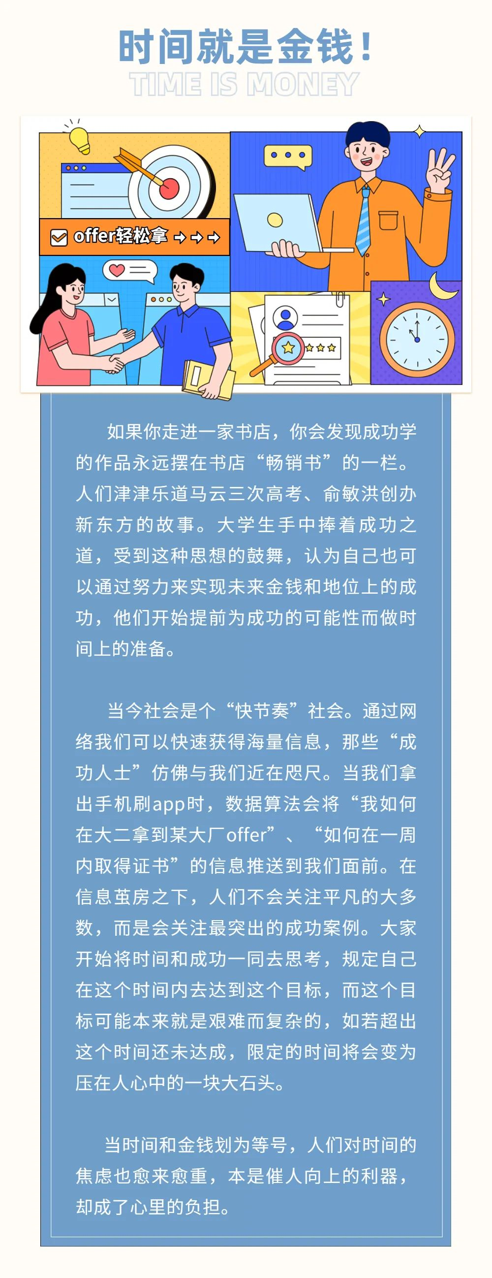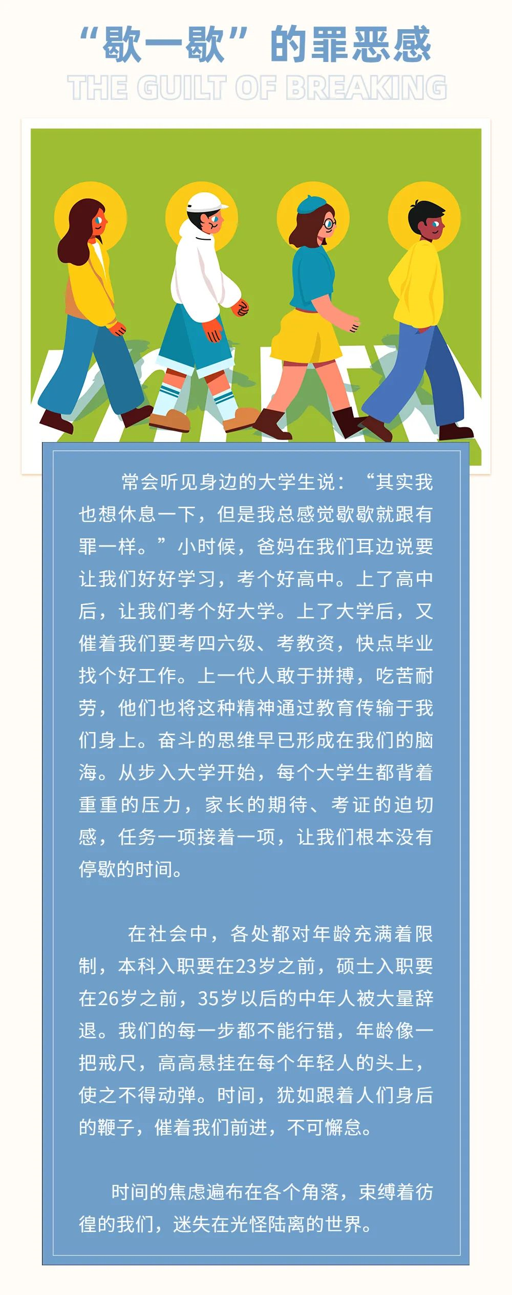 像他们这样的大学生还有很多,他们忙于社团生活,忙于学习冲绩点,忙于实习,不敢让自己放松下来。他们内心承担着巨大的压力,对于自己的休息有着巨大的负罪感,认为这是玩物丧志的表现,只能逼迫着自己将精力投于学习之中。我们可以将他们这种心理归为“时间焦虑”。