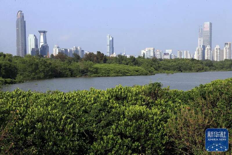 从深圳湾北东岸深圳河口的红树林自然保护区远眺深圳市区拔地而起的建筑群。新华社记者 李明放 摄