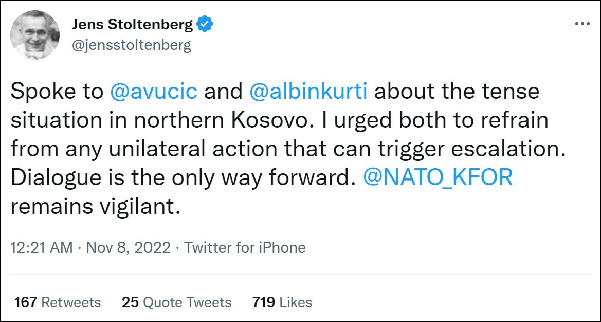 斯托尔滕贝格还在推特发文称,已与武契奇和科索沃“总理”阿尔宾·库尔蒂(Albin Kurti)就科索沃北部紧张局势进行了交流,“我敦促两人不要采取任何可能引发冲突升级的单边行动。对话是唯一的出路”。