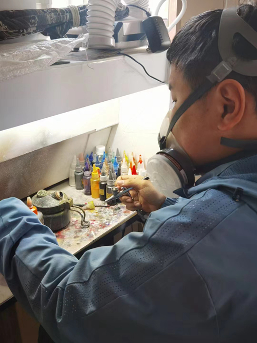 厂子里的集装箱被他改造成工作室。大桌子上摆放电脑和模型制作工具,背后是他喷涂上色的工作台。为了减少油漆的毒性,他买来材料,动手加装了排气扇和通风管,一天能在里面待14个小时。