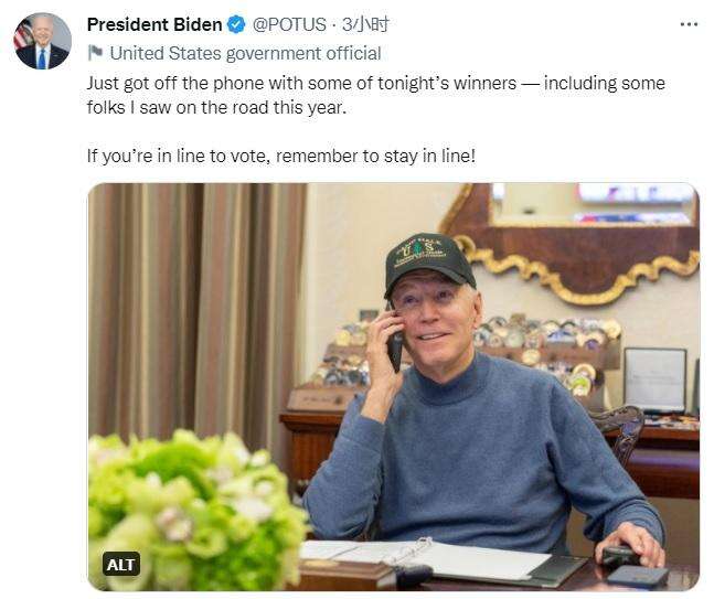 当地时间11月8日,美国总统拜登在推特上发布照片,称已致电部分胜选者。图片来源:拜登推特账户截图