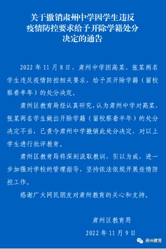 11月9日,作为涉事中学的上级主管部门,甘肃省酒泉市肃州区教育局发布通报,证实了这起事件的真实性,并表示:肃州区教育局经认真研究,认为肃州中学对高某张某两名学生做出开除学籍(留校察看半年)的处分决定不当,已责令肃州中学撤销此处分决定,对涉事学生进行批评教育。