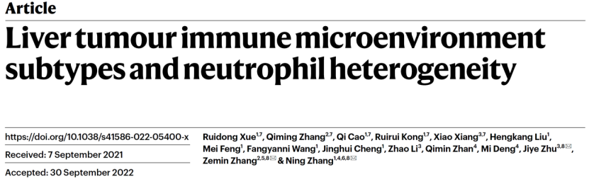 2022年11月9日,北京大学第一医院肿瘤转化研究中心张宁团队与北京大学生物医学前沿创新中心(BIOPIC)张泽民团队、北京大学人民医院肝胆外科朱继业团队紧密合作,在Nature发表了题为“Liver tumor immune microenvironment subtypes and neutrophil heterogeneity”的研究论文。