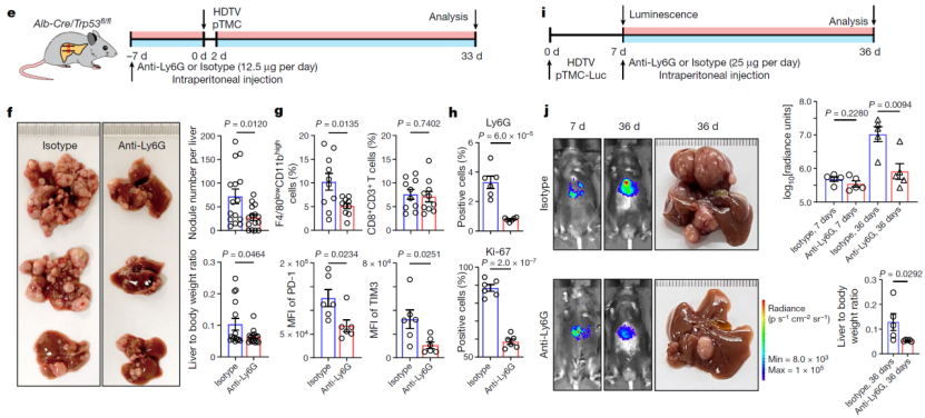图4 Anti-Ly6G抗体去除中性粒细胞可以有效缓解小鼠肝癌生长