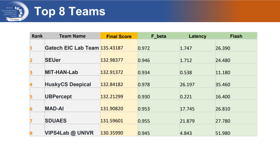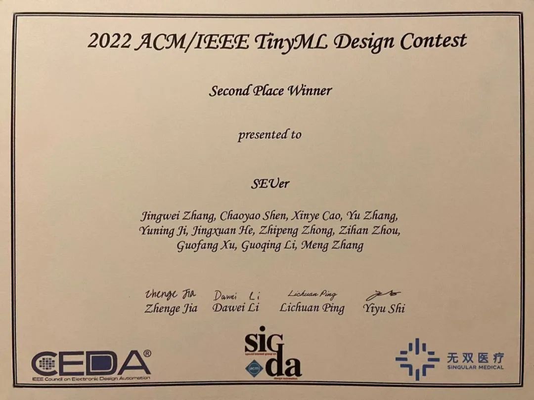 在今年新设的TinyML(Tiny Machine Learning)赛道上, 经过激烈角逐,东南大学电子科学与工程学院、微电子学院的SEUer团队 (团队成员:张经纬、沈朝瑶、曹新野、张雨、计育宁、何镜旋、钟智鹏、周子涵、徐国方、李国庆、张萌老师等)继今年7月初荣获国际著名的设计自动化(DAC)会议的系统设计竞赛(SDC)冠军 之后,再次以“东大人”的名义在TinyML赛道上奋勇拼搏,对部署在低功耗处理器上的TinyML算法做了深度优化和系统协同设计,在精度、召回率、推理延迟和存储占用等方面,综合指标优异,最终荣获第二名 的好成绩。