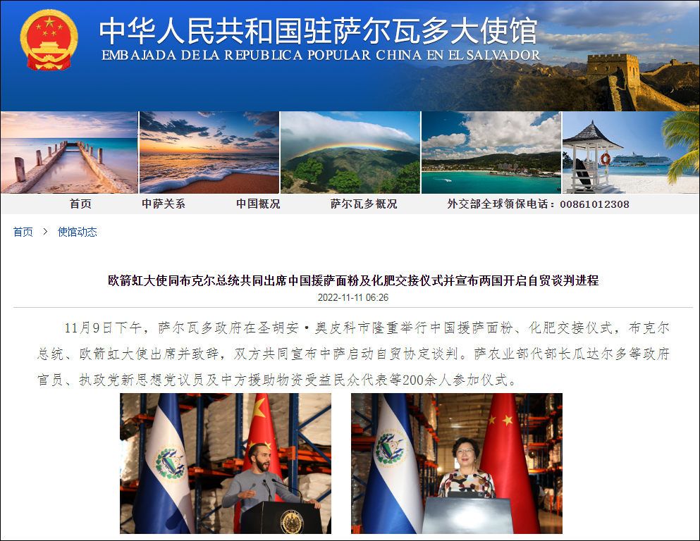 据中国驻萨尔瓦多大使馆网站消息,11月9日下午,萨尔瓦多政府在圣胡安·奥皮科市隆重举行中国援萨面粉、化肥交接仪式,布克尔总统、欧箭虹大使出席并致辞,双方共同宣布中萨启动自贸协定谈判。