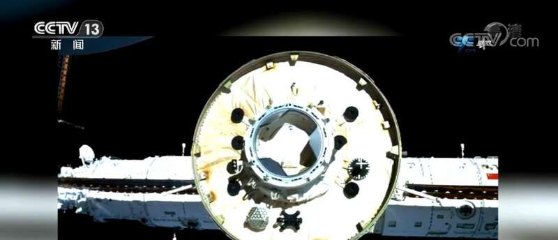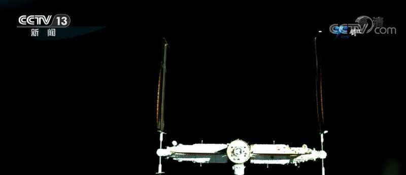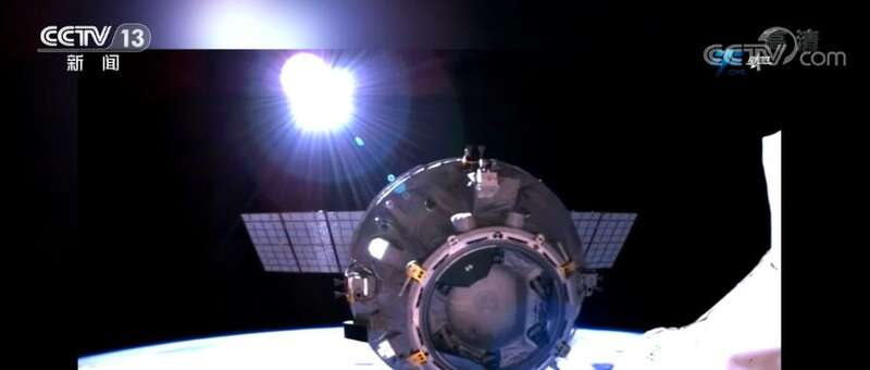 画面中看到的就是从核心舱后向视角看到的,逐渐远离核心舱的天舟四号货运飞船。而这个角度,是撤离中的天舟四号货运飞船上的高清摄像头拍到的核心舱后向对接口。
