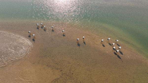 片片浅滩之上,一群群鸟儿掠过,时而在空中盘旋,时而在水中游弋,生机盎然。新华网发(杨斌 摄)